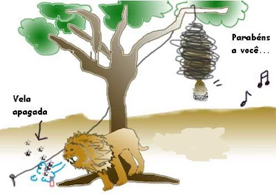 Imagina que você está na África, pendurado numa árvore por uma corda que está presa no chão. Uma vela está queimando a corda e um leão está em baixo só esperando que a corda arrebente pra te devorar.
