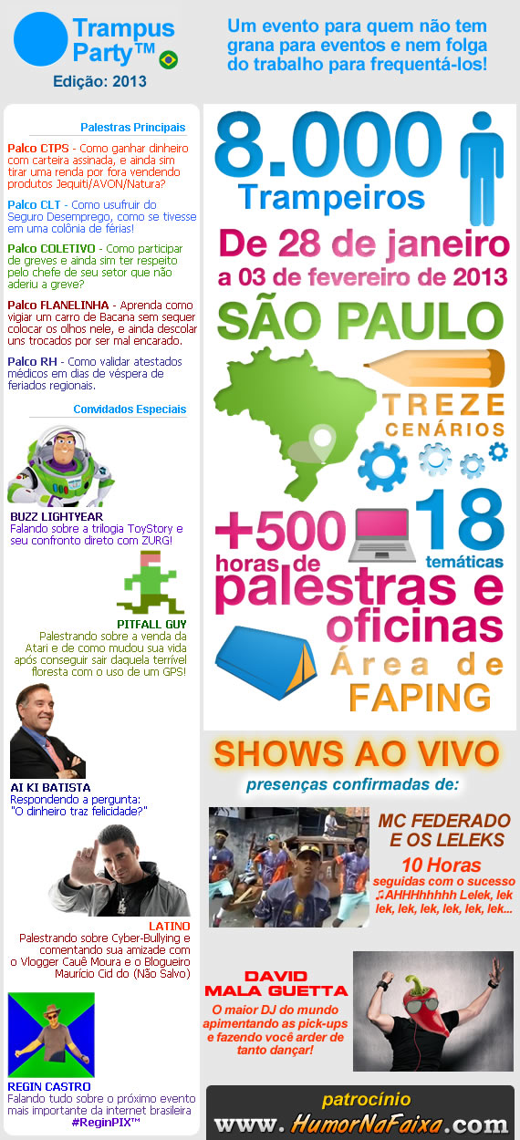 Início TIRINHAS Trampus Party 2013 TIRINHAS Trampus Party 2013 jan 31, 2013 1295 0 Vi lá no Humor na Faixa Este post tem alguma imagem e/ou video que não está aparecendo ou funcionando? Avise-nos clicando aqui ! Artigos relacionadosMais do autor Mundo injusto Enquanto isso no Tinder… Cantada Nerd